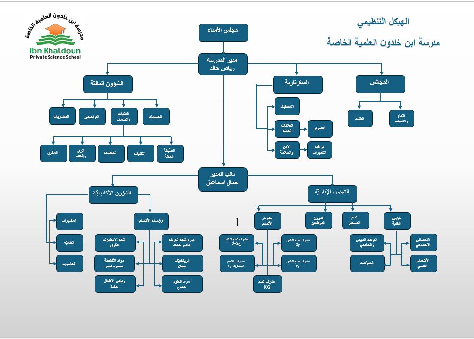 الهيكل التنظيمي للمدرسة يشير الى ترتيب وتنظيم المسؤوليات والسلطات والعلاقات داخل المدرسة .